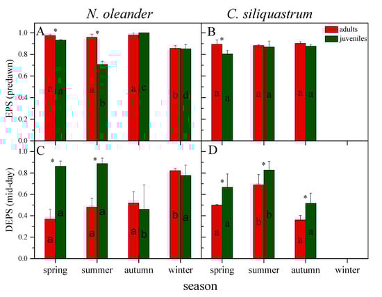 Figure 5. Seasonal changes in predawn epoxidation state (EPS) and midday de-epoxidation state (DEPS) for adults (red columns) and juveniles (green columns) of N. oleander (A,C) and C. siliquastrum (B,D). Data are means ± SD of 3 independent extractions. Within each species, asterisks denote statistically significant differences (p < 0.05) between adults and juveniles in the same season, while different letters indicate statistically significant differences (p < 0.05) of adults or juveniles between seasons. EPS = (V + 0.5 A)/VAZ, DEPS = (Z + 0.5 A)/VAZ.