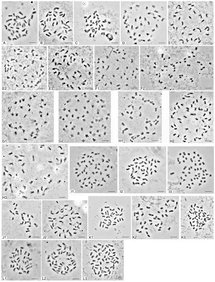 - Wang, Y.; Wang, X.R.; Chen, Q.; Zhang, L.; Tang, H.R.; Luo, Y.; Liu, Z.J. Phylogenetic insight into subgenera Idaeobatus and Malachobatus (Rubus, Rosaceae) inferring from ISH analysis. Mol. Cytogenet. 2015, 8, 11. [Google Scholar] [CrossRef]