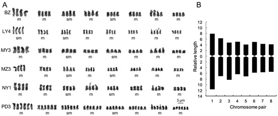 At least three metaphase cells with clear chromosome morphology were selected for karyotype analysis. The position of the centromere was determined, and the chromosome karyotype was analyzed based on the size and morphological characteristics. Relative chromosome length, arm ratio and chromosome type were calculated using Levan’s nomenclature [54]. The karyotype asymmetry coefficients were calculated, and the karyotypes were classified according to Stebbins’ criteria [55].