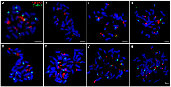 - Fukui, K.; Kamisugi, Y.K.; Sakai, T. Physical mapping of 5S rDNA loci by direct-cloned biotinylated probes in barley chromosomes. Genome 1994, 37, 105–111. [Google Scholar] [CrossRef]