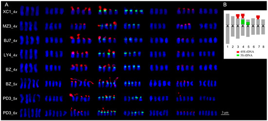 rDNA-FISH on metaphase chromosomes in polyploid Chinese cherry. (A) Xichang 1 (4x), (B) Mengzi 3 (4x), (C) Bijie 7 (4x), (D) Luoyang 4 (4x), (E) Bazhong (4x), (F) Bazhong (5x), (G) Puding 3 (5x), (H) Puding 3 (6x). The red and green signals indicate 45S and 5S rDNA sites, respectively. Scale bar represents 3 μm.