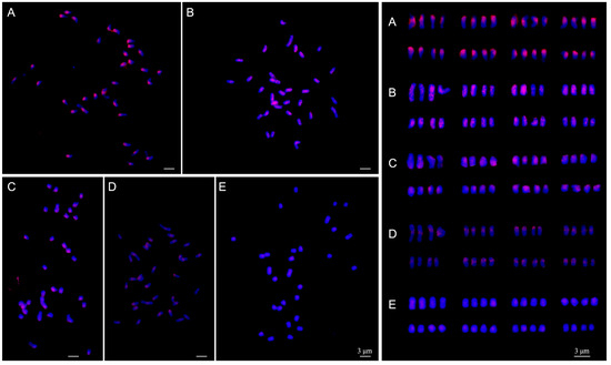 One approach to determine the genome composition of polyploids is to investigate chromosome pairing behavior during meiosis. Autopolyploids exhibited multivalent through homologous chromosome pairing, leading to gametes with varying numbers of chromosomes [16]. Karyotype analysis aids in understanding chromosome morphology and homologous pairing, providing another means to study the auto- or allo-polyploidy origin of a species. In species with small and identical chromosomes, physical mapping of ribosomal DNA (rDNA) loci facilitates homologous pairing. The fluorescence in situ hybridization (FISH) technique, employing repetitive DNA probes, has been widely used to identify auto- or allopolyploids in plants [17,18,19]. Genomic in situ hybridization (GISH), a variant of FISH, utilizes whole genomic probes for suppressive hybridizations to visualize individual genomes in hybrids and polyploids, illustrating the genetic relationship between relative species [20,21]. The hybridization signals not only represent common DNA sequences, but also demonstrate genomic homology between the two species [22].