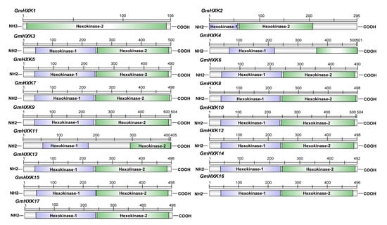 Hexose sugar, the main carbon source of energy storage, is essential for cellular life and metabolism [38]. Hexoses can also function as signaling molecules, playing roles in a wide range of cellular processes [2]. To be used, hexoses must first be phosphorylated, a process that can be carried out by hexose-phosphorylating enzymes such as HXKs [2,22]. Hexokinases (HXKs) have been discovered in a wide variety of plant species due to the wide range of functions served by hexokinases that phosphorylate fructose and glucose. So far, few details about the function of the HXK gene in soybeans have been reported. Seventeen HXK genes (GmHXK1-17) were mapped out in the soybean genome in this study (Supplementary Table S1), which was similar to that reported in a recent study [18]. The phylogenetic analysis indicated that GmHXK1, -2, -3, and -4 belonged to the type-A subfamily group, while GmHXK5-17 were in the type-B subfamily group (Figure 1, Figure 2 and Figure 3). All seventeen GmHXK genes were found on ten different chromosomes (Figure 3). A great deal of variation has been found within the HXK gene family in plants; for example, A. thaliana has six subfamilies [22], Zea mays has nine [12] and Oryza sativa has ten [14], all of which are dispersed across various chromosomes. All GmHXKs, except for GmHXK5 and GmHXK11, are encoded by a total of nine exons (Figure 3). There are clear similarities between the intron–exon structure of the GmHXKs and that of other identified plant HXK genes.