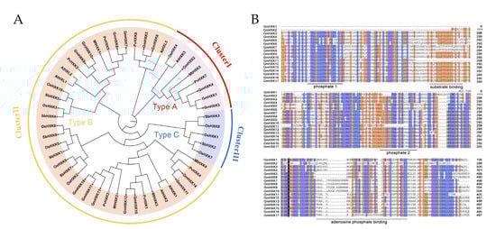 To examine the evolutionary relationships between GmHXK and other plant HXKs, a phylogenetic tree was constructed using 51 full-length HXK sequences. This included six HXKs from A. thaliana and ten from Oryza sativa, five protein sequences from Medicago truncatula, seven protein sequences from Phaseolus vulgaris, seven protein sequences from Sorghum bicolor, and sixteen protein sequences from G. max. Chromosomal localization sequences and associated accession numbers can be found in Supplementary Table S2. In Figure 2A, GmHXK members were assigned to one of three evolutionary clusters (I, II, and III). GmHXK1-4 were found in Cluster I, together with two other type-A HXKs (AtHXK3 and OsHXK4) that contain the chloroplast transit peptide. Clade II comprised type-B isoforms, containing GmHXK5-17, as well as eleven type-B HXKs (OsHXK2, -3, -5, -6, -9, and -10; AtHXK1-2; and AtHLK1-3). Three OsHXKs (OsHXK1, -7, and -8) were identified as type-C isoforms; these proteins lack membrane-anchored domains and chloroplast transport peptides, placing them in Clade III. No similar sequences of type-C OsHXKs were found in the phylogenetic tree of soybean plants. The in silico prediction made by GmHXKs indicated that the phylogenetic clades were comparable to one another.