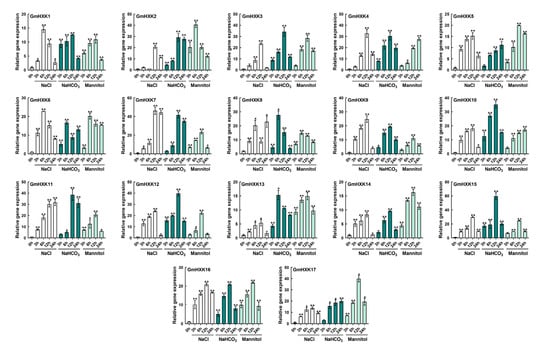 GmHXKs expression profiles in soybean plant roots subjected to 120 mM of NaCl, 100 mM of NaHCO3, 200 mM of mannitol, or water (control) for 0, 6, 12, and 24 h, each. GmHXKs were estimated under non-stressed conditions to function as a calibrator. Each experiment was performed in triplicate. Moreover, the qRT-PCR results were examined using the 2−ΔΔct method. Asterisks above bars signify a difference regarding statistical significance, as determined by Student′s t-test (* p < 0.05, ** p < 0.01).