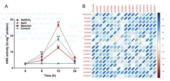 In soybean, HXK activity levels were determined under abiotic stress treatments. (A) HXK activity was evaluated for 0 h, 6 h, 12 h, and 24 h in roots of soybean plants treated with 120 mM of NaCl, 100 mM of NaHCO3, 200 mM of mannitol, or water (control). Biological replicates were represented by means ± SD. Statistically significant differences from the control group, as determined by Student’s t-test, are indicated by asterisks above the bars (* p < 0.05; ** p < 0.01). (B) The correlation coefficient between HXK enzymatic activity and the expression levels of GmHXKs. Correlation coefficients between any two traits are shown as ellipses on each chart. The correlation magnitude is determined by the color and slope of the ellipse. Negative correlations are represented by a red ellipse, and positive correlations by a blue ellipse.
