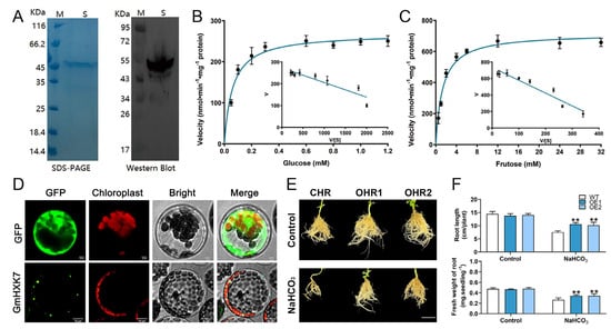 Overexpression of GmHXK15 confers alkali tolerance in transgenic soybean hairy roots. (A) Purified GmHXK15 fusion proteins were resolved by SDS-PAGE and Western blotting (Lane S). The Eadie–Hofstee plot depicts the kinetic characteristics of GmHXK15 in response to (B) glucose and (C) fructose. (D) Subcellular localization analysis of GmHXK15 by expressing GmHXK-GFP fusion protein transiently in Arabidopsis mesophyll protoplasts. (E) Performance and (F) maximum root lengths and root fresh weights of GmHXK15 -OHR and CHR plants subjected to 100 mM NaHCO3 over 5 days. Bars = 5 cm. Asterisks denote significant differences (** p < 0.01) from CHR plants, as shown by Student’s t-test.