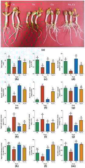To reflect secondary oxidative stress in roots, O2−, H2O2, and MDA contents under different treatments were measured. Correspondingly, three antioxidant enzyme activities were also measured. Na treatment significantly increased O2− and MDA content in roots compared with CK treatment (p < 0.05), while Na_Ca treatment significantly decreased them (p < 0.05) compared with Na treatment (Figure 1h,j). There was no significant difference in root H2O2 under the four treatments (Figure 1i). Na treatment significantly decreased SOD and POD activity (p < 0.05) compared to CK, while Na_Ca treatment significantly improved CAT and POD activity (p < 0.05) (Figure 1l,m).