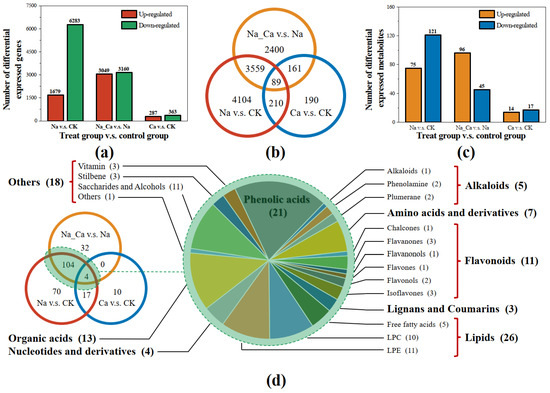 Screening of differentially expressed genes (DEGs) and differentially metabolites (DEMs). (a) Differentially expressed genes (DEGs) number in three pairwise comparison groups; (b) Venn diagram of differentially expressed genes (DEGs) shared by two pairwise pairwise comparison groups; (c) differentially expressed metabolites (DEMs) number in three pairwise comparison groups; (d) Venn diagram of differentially expressed metabolites (DEMs) shared by two pairwise comparison groups. Treatments: CK, untreated; Na, treated with 150 mmol/L NaCl; Ca, treated with 15 mmol/L CaCl2; Na_Ca, 150 mmol/L NaCl and 15 mmol/L CaCl2 Co-treatment. Two pairwise comparison groups: Na vs. CK and Na_Ca vs. Na (experimental group vs. control group).