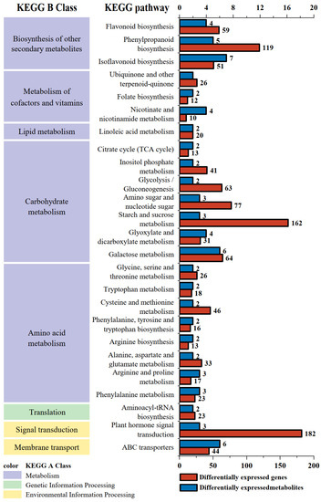 For the KEGG A class level, 22 pathways belonged to the metabolism class, 2 to the environmental information processing class, and 1 to the genetic information processing class (Figure 3). Therefore, pathways belonging to metabolism (KEGG A class) enriched the most DEGs and DEMs. For its subordinate class (KEGG B class), the carbohydrate metabolism class contained seven pathways, the amino acid metabolism class contained eight pathways, and the biosynthesis of other secondary metabolites class contained three pathways.