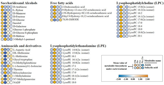 The above results showed that salt stress up-regulated three types of lipid (LPE, LPC, and FFAs) biosynthesis and down-regulated saccharides and alcohols, amino acids, and their derivatives biosynthesis, while exogenous calcium down-regulated these three types of lipids biosynthesis and up-regulated saccharides and alcohols, amino acids, and their derivatives’ biosynthesis under salt stress.