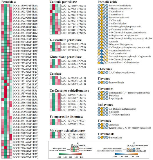 For phenolic acids and flavonoids, which are important non-enzymatic antioxidants, most DEMs exhibited diametrically opposed expression patterns to the antioxidant enzyme DEGs under different treatments. Also, we noted that 5 of the 20 differentially expressed phenolic acids showed the opposite expression pattern to others under different treatments. They were: 4-aminobenzoic acid, cis-coumaric acid, 2-acetyl-3-hydroxyphenyl-1-O-glucoside, 4-O-glucosyl-sinapate, and anthranilate-1-O-sophoroside.