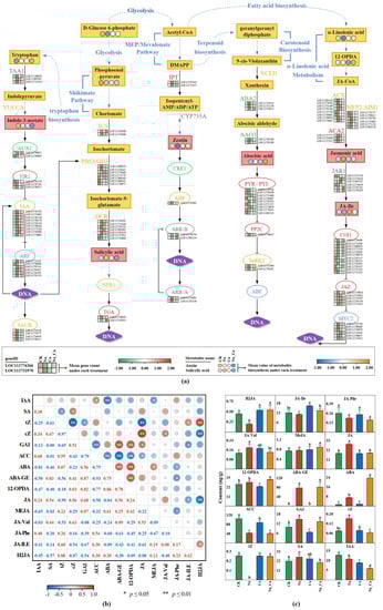 2.5. Comprehensive Analysis of Differentially Expressed Genes and Metabolites in Phytohormone Biosynthesis and Signal Transduction Pathways