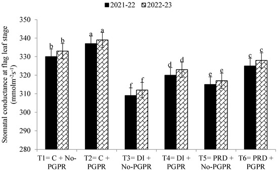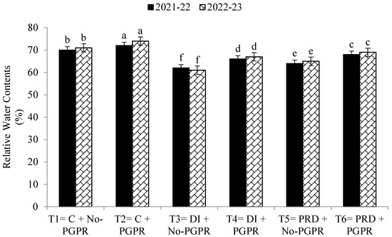 | T5 = PRD + No PGPR | 24.12 e | 23.15 e | 11.41 e | 10.32 e | 54.37 e | 52.26 e | 1.09 e | 0.83 e | 21.47 e | 22.31 e |