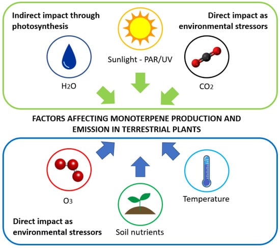 Abiotic drivers, such as temperature, light, humidity, CO2 concentration, soil nutrients, etc., have been reported to influence monoterpene emissions from various plant species [27,47,48,49,50,51]. A summary of these factors and their impact on monoterpene production and emission are shown in Figure 1.