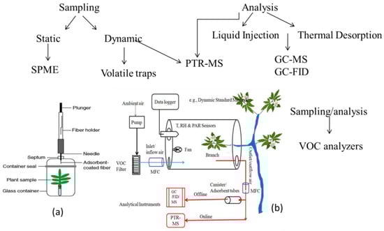 A schematic diagram of common analytical methods for determination of emission levels of monoterpenes from plants. (a) Static chamber method. (b) Dynamic enclosure chamber approach. (See text for abbreviations: Section 4).