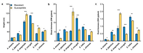 Morphology characteristics of herbicide-resistant and -susceptible weeds at the flowering stage. (a), plant height; (b), shoot biomass; (c), root biomass. Asterisks indicate significant difference between resistant and susceptible biotypes, Student’s t-test, * p < 0.05, ** p < 0.01, *** p < 0.001.