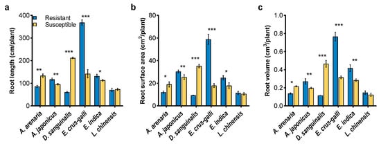 Root measurements of herbicide-resistant and -susceptible weeds at the seedling stage. (a), root length; (b), root surface area; (c), root volume. Asterisks indicate significant difference between resistant and susceptible biotypes, Student’s t-test, * p < 0.05, ** p < 0.01, *** p < 0.001.