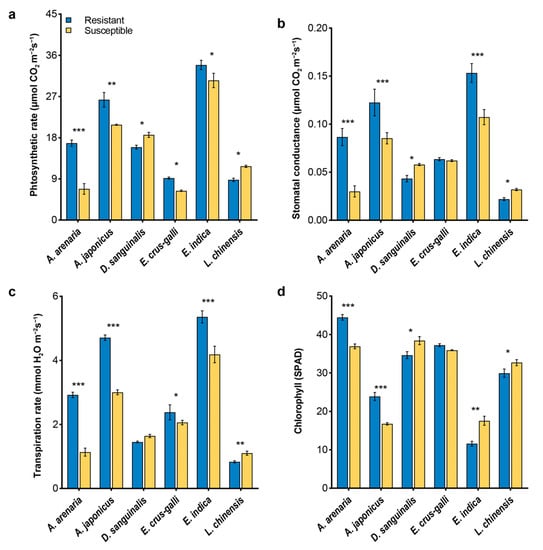 Photosynthetic parameters and chlorophyll concentrations of herbicide-resistant and sus−ceptible weeds during the flowering stage. (a), photosynthetic rate; (b), stomatal conductance; (c), transpiration rate; (d), chlorophyll. Asterisks indicate significant difference between resistant and susceptible biotypes, Student’s t-test, * p < 0.05, ** p < 0.01, *** p < 0.001.