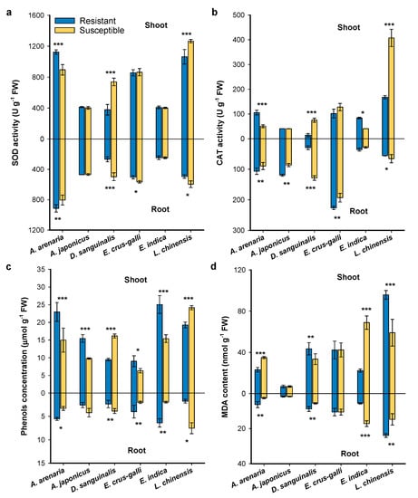 Effects of herbicide resistance on superoxide dismutase (SOD) activity (a), catalate (CAT) activity (b), total phenolic content (c), and malondialdehyde (MDA) content (d) of resistant and sus−ceptible weeds at the flowering stage. Asterisks indicate significant difference between resistant and susceptible biotypes. Student’s t-test, * p < 0.05, ** p < 0.01, *** p < 0.001.