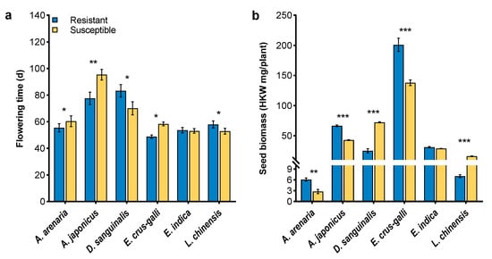 Flowering marks the transition from vegetative to reproductive growth, which is of great significance in plant fitness [31,53,54]. Early-flowering plants are favored in terms of reproductive success [55]. Resistance plays a role in the evolution of the flowering and reproductive traits of herbicide-resistant weeds [30]. In the current study, herbicide-resistant A. arenaria, A. japonicus, and E. crus-galli accelerated flowering relative to those susceptible biotypes, and improved seed biomass (Figure 5). However, herbicide-resistant D. sanguinalis and L. chinensis with delayed flowering exhibited poor fecundity when compared with their susceptible biotypes, which led to significant fitness costs at that reproductive stage.