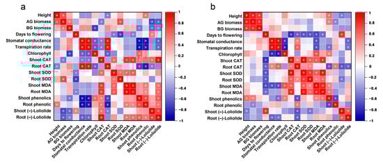 The correlations between the morphological, physiological, and biochemical indices of resistant and susceptible weeds. (a), resistant weeds; (b), susceptible weeds, Student’s t-test, * p < 0.05.