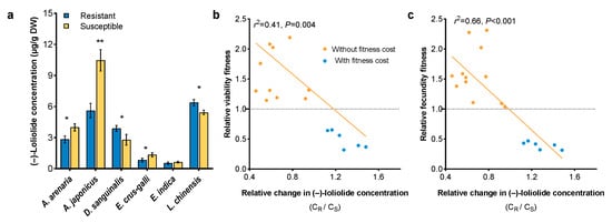 (–)-Loliolide concentration (a) in herbicide-resistant and -susceptible weeds, and relationships between the relative change in (–)-loliolide concentration (CR/CS) and relative viability fitness (b) and fecundity fitness (c). CR means (–)-loliolide concentration for resistant biotype, CS for susceptible biotype. Asterisks indicate significant difference between resistant and susceptible biotypes, Student’s t-test, * p < 0.05, ** p < 0.01.
