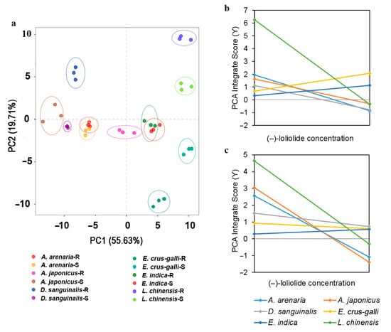 Compared with herbicide-susceptible biotypes, resistant A. arenaria, A. japonicus, and E. crus-galli had higher (–)-loliolide concentration, while resistant D. sanguinalis and L. chinensis had lower (–)-loliolide concentration. Resistant and susceptible E. indica biotypes had similar (–)-loliolide concentration (Figure 7a). Furthermore, the (–)-loliolide concentration was negatively associated with flowering time in both resistant and susceptible weeds (resistant: r2 = 0.47, p = 0.03; susceptible: r2 = 0.66, p < 0.001) (Figure 7b,c).