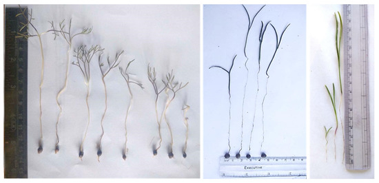 Seed germination and early crop stand are the main stages for the normal growth and development of this plant. It is a multifaceted physiological process that is influenced by various environmental factors (viz., water potential, light period, etc.). Generally, it is controlled by growth inhibitors [7]. Low seed germination is a major limitation for mass-scale cultivation of this crop. According to the reports, the main reason for the low germination rate of Umbelliferaceae species is that the embryos are small and lack oxygen during seed germination. Naturally, the seeds germinate in 90–100 days after passing through the chilling temperatures of the winter season and produce only two leaves and pinhead-sized tubers, approximately 4–6 mm, during the first year of cultivation [1,8]. The reproductive period (seed production) of Bunium persicum begins after 4 years and lasts up to 8–10 years as the tuber continues to grow. The economic production of the crop starts after 4 years when the tuber weight is >3 g, and this long duration from sowing of seed to flower production hinders the cultivation of this valuable crop by farmers [3].