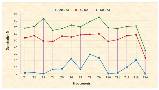 Results of seed germination showed that stratification at a chilling temperature of 2–5 °C increased the percentage of seed germination. The combination of stratification and treatment with PGRs greatly improved the germination percentage and had a significant influence on breaking the dormancy of Bunium persicum seeds. A perusal of pooled data over years, presented in Table 2 and depicted in Figure 3, showed that amongst various PGRs used, the combination treatment T8 (GA3 (25 ppm) + TDZ (6 µM/L)) showed the highest germination percentage, which was at par with T9 (GA3 (25 ppm) + TDZ (9 µM/L)) at 20 days as compared to other combination treatments, as well as control; however, amongst the sole treatments, treatment T6 (TDZ (9 µM/L) exhibited a higher germination percent as compared to other treatments, while T3 (GA3 (50 ppm)) showed no effect on seed germination at the 20 days interval. At 40 days after treatment, the germination percent ranged between 23.0 and 70.0%. Among treatments, T9 (GA3 (25 ppm) + TDZ (9 µM/L)) revealed the maximum germination percent, followed by T12 (GA3 (25 ppm) + TDZ (3 µM/L) + jasmonic acid (50 ppm)), T7 (GA3 (25 ppm) + TDZ (3 µM/L)), and T8 (GA3 (25 ppm) + TDZ (6 µM/L)), while the lowest germination percent of 23.0 was recorded under the control treatment.