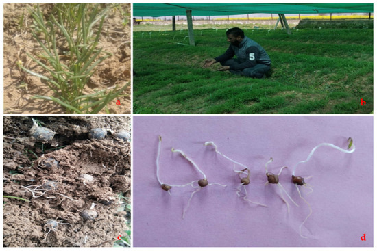 Tuber development of Bunium persicum under field conditions: (a) seed germination under pot culture; (b) nursery development of 14 treatments; (c) tuber development after 3 years; and (d) treatment effect on tuber development.