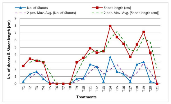 As noted by Campbell [34], in addition to gibberellin, there are other growth hormones such as auxin and cytokinin that affect the growth of shoots. The optimal application of auxins and cytokinins will promote cell divisions and differentiations to produce new shoots. According to Santoso [35], the difference in endogenous hormones in each explant, even when cultured in the same culture medium, can affect its response to the addition of growth regulators. The relationship between the growth regulators (exogenous) and plant endogenous substances will increase the growth and morphogenesis of the culture [24,36]. Murni [37] reported that seeds contain growth regulators such as auxins, cytokinins, gibberellins, and so on, which help in the growth and development of the seedling under in vitro as well as in vivo conditions.