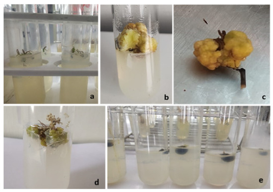 In an experimental study, the effect of hormones on in vitro cultures showed that sole application of BA and NAA increased the growth rate of callus, while the combined application of BA and NAA were effective in shoot and root multiplication of the explants. The callus induction time in explants from various treatments was affected by many factors, including differences in shoot and root elongation, concentration of growth regulators added to the medium, different endogenous hormone concentrations in the explant, and differences in the cell potential, respectively. It has been reported that the interaction between auxins and cytokinins plays an important role in cell differentiation and organogenesis in tissue and other cultures [28]. Fresh weight of the callus was affected by the absorption of water and other substances in the basal environment, which is responsible for cell expansion, cell division, and new material, which leads to an increase in callus dry weight, as well as shoot and root formation [29]. The type and concentration of growth regulators, such as auxins and cytokinins, are considered as important components in callus initiation for production of secondary metabolites [30]. The present findings are well supported by the previous studies that have revealed good growth of callus by using a combination of NAA and BA in epicotyl and leaf explants of black cumin [31,32,33].