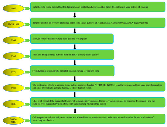 To address the above problems, tissue culture approaches have developed rapidly in recent years to produce bioactive compounds with high content and activities that not only have health-promoting properties but also significantly alter natural sources. The first attempt at plant cell cultivation was by the Austrian botanist Haberlandt in 1902, who isolated plant cells and cultivated them outside the whole plant [21]. The successful development of a nutrient medium by Murashige and Skoog in 1962, commonly known as MS medium, has remained in use, with minor adjustments [22]. The introduction of this specific nutrient medium, along with a range of plant growth regulators (PGRs), has significantly revolutionized the field of plant tissue culture research, leading to its successful integration as a viable commercial venture offering numerous advantages and possibilities. Multiple investigations have subsequently demonstrated that undifferentiated plant cells, such as calluses and cell suspensions, can be a valuable resource for producing identical secondary metabolites found in naturally occurring plants. It represents a significant advancement in plant research, over a century after Haberlandt’s initial attempts in the field [23]. Plant tissue culture technology is helpful for plant transformation, clonal propagation, breeding, and protection of pharmaceutical plants and crops. Figure 1 describes the history and establishment of ginseng species’ in vitro plant tissue culture [24,25,26,27,28,29,30].
