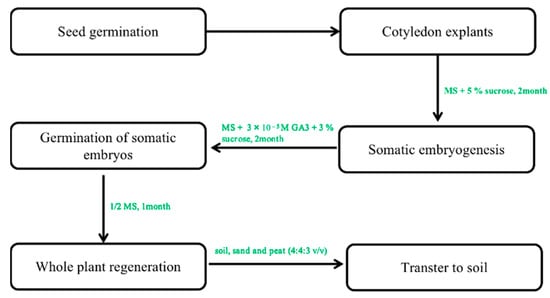 In contrast, multiple fused somatic embryos result in multiple shoots [50]. Only the study by Choi et al. [29,30] reported the successful transfer of somatic embryos induced from cotyledon explants on hormone-free media at 12–66% frequency in the regenerated plant. In his study, ginseng plants with well-developed shoots and roots regenerated from single embryos were successfully domesticated in a greenhouse when planted in soil (Figure 4) [56]. This regeneration protocol is very effective in the induction of whole plants.