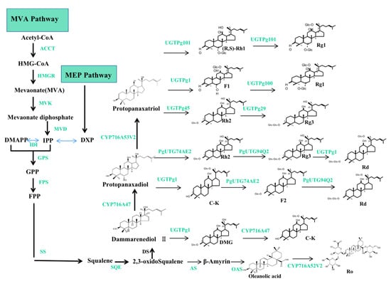 The biosynthetic pathways of ginsenosides have been demonstrated, as shown in Figure 5. Generally, two pathways and three stages are involved in the biosynthesis of ginsenosides. The production of ginsenosides occurs in the cytosol and plastids through the mevalonic acid (MVA) pathway and the methylerythritol (MEP) pathway. The three stages are as follows: (1) firstly, isopentenyl diphosphate (IPP) and its isomer dimethylallyl diphosphate (DMAPP) are produced via the MVA and MEP pathways; (2) IPP and DMAPP are then transformed into 2,3-oxidosqualene; and (3) ginsenosides (such as Rh1, Rh2, Rg1, Rg3, Rd, C-K, F2, and Ro) are created via three reaction steps from 2,3-oxidosqualene, which include cyclization, hydroxylation, and glycosylation. The biosynthetic pathways of ginsenosides consist of more than 20 steps of consecutive enzymatic reactions, including enzymes, for example: 3-hydroxy-3-methylglutaryl coenzyme A reductase (HMGR), farnesyl pyrophosphate synthase (FPS), squalene synthase (SS), squalene epoxidase (SQE), dammarenediol-II synthase (DS), β-amyrin synthase (AS), cytochrome P450 (CYP450), and UDP-glycosyltransferase (UGT) [62,63,64].