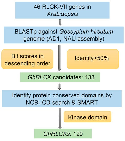 Genome-wide identification pipeline of GhRLCKs in Gossypium hirsutum. Forty-six Arabidopsis RLCK-VII protein sequences were used as templates for BLASTp against G. hirsutum genome (AD1, NAU assembly) in CottonFGD. GhRLCK candidates were further refined using protein domain prediction tools (NCBI-CD search and SMART) to eliminate non-RLCKs by manually checking the protein motifs.