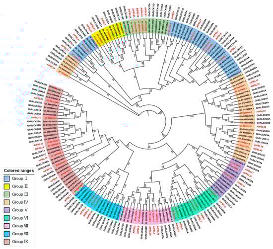 Phylogenetic analysis of RLCK-VII family members from G. hirsutum and A. thaliana. The phylogenetic tree was constructed using the protein sequences of 46 genes from A. thaliana and 129 genes from G. hirsutum. These genes were divided into 9 groups (Group I-IX) and are indicated by different colors. The genes from A. thaliana are labeled in red.
