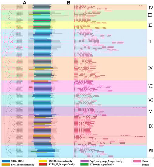 Dendrogram, gene structure, and conserved domain of RLCK- VII subfamily genes. (A) The conserved domains of these genes were predicted using NCBI-CDD. The protein domain schematics are included at the bottom. (B) Exon–intron structure. Pink boxes and grey horizontal lines represent exons and introns, respectively. Different groups are indicated by different colors and the group numbers are shown on the right.