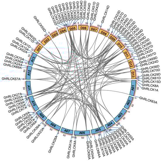 The syntenic analysis of GhRLCK members. The relationship is presented using Circos software. The paralogous gene pairs are linked with gray lines. Chromosomes from the At and Dt sub-genomes are indicated in blue and orange.