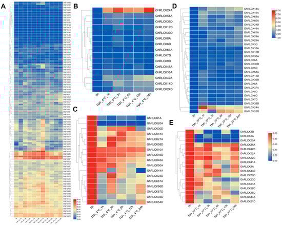 Expression profiles of GhRLCK genes in response to low (4C) and high (37 °C) temperatures. (A) Overview of expression abundances of GhRLCKs in response to low (4 °C) and high (37 °C) temperatures. Heatmap was generated based on FPKM values. (B) Upregulated genes upon 4 °C treatment. (C) Downregulated genes upon 4 °C treatment. (D) TE upregulated genes under 37 °C treatment. (E) Downregulated genes under 37 °C treatment. Heatmaps were generated based on relative expression levels (B–E). Scale bars are indicated on the left.