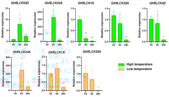 Expression levels of GhRLCK genes in response to low (4C) and high (37 °C) temperatures according to RT-qPCR analysis. Data are presented as mean ± SE from three independent repeats. Asterisks represent significant differences compared with results at 0 h according to two-tailed Student’s t-tests (* p < 0.05, ** p < 0.01).