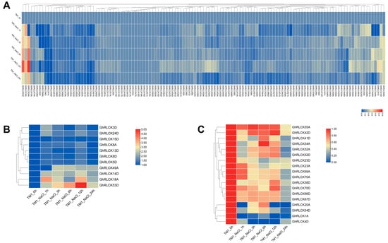 The expression patterns of GhRLCKs in response to salt treatment. (A) The overview of GhRLCK expression in response to NaCl treatment. The heatmap was generated based on the FPKM values. (B) The upregulated genes under NaCl treatment. (C) The downregulated genes under NaCl treatment. The heatmaps were generated based on the relative expression levels (B,C). The scale bars are presented adjacent to the charts.