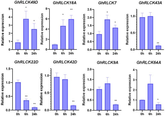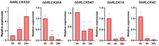 Expression levels of GhRLCK genes in response to V.dahliae infection according to RT-qPCR analysis. Data are presented as mean ± SE from three independent repeats. Asterisks represent significant differences compared with results at 0 h according to two-tailed Student’s t-tests (* p < 0.05, ** p < 0.01).