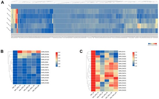 The expression patterns of GhRLCKs in response to PEG-mimic drought treatment. (A) An overview of GhRLCK expression in response to PEG. The heatmap was generated based on the FPKM values. (B) The upregulated genes under PEG treatment. (C) The downregulated genes under PEG treatment. The heatmaps were generated based on the relative expression levels (B,C). The scale bars are presented adjacent to the charts.