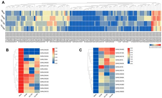 The expression levels of GhRLCKs in response to V. dahliae infection. (A) An overview of GhRLCK expression upon V. dahliae infection. The heatmap was generated based on the FPKM values. (B) The downregulated genes induced through V. dahliae inoculation. (C) The upregulated genes in response to V. dahliae infection. The heatmaps were generated based on the relative expression levels (B,C). The scale bars are presented adjacent to the charts.
