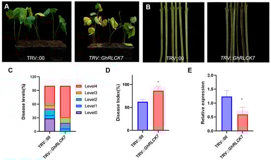 Based on the significant change in expression level upon V. dahliae infection, GhRLCK7A and D were selected to investigate their role in cotton’s response to V. dahliae. A VIGS vector (TRV::GhRLCK7) targeting both genes was constructed for gene silencing. After V. dahliae inoculation, GhRLCK7-silenced seedlings (TRV::GhRLCK7) exhibited more serious wilting, yellowing, and defoliation on their leaves, while the disease symptoms in the control (TRV::00) plants showed mild symptoms and only partial wilting was observed (Figure 13A). Meanwhile, the degree of vascular browning in TRV::GhRLCK7 plants was much more severe than that in TRV::00 plants (Figure 13B). The severity of the disease was further recorded and evaluated by disease level and disease index. Fifteen days after V. dahliae inoculation, we documented the number of plants displaying each disease level (1–4). The ratios of TRV::GhRLCK7 plants with their corresponding levels were as follows: 6.25%, level-1; 12.5%, level-2; 12.5%, level-3; and 68.75%, level-4, and those of the control plants were 28.57%, level-0; 7.14%, level-1; 14.29%, level-2; 7.14%, level-3; and 42.86%, level-4 (Figure 13C). The disease index of TRV::GhRLCK7 plants (86.36%) was significantly higher than that of TRV::00 plants (62.28%) at 17 dpi (Figure 13D). Consistently, TRV::GhRLCK7 plants were more susceptible to V. dahliae infection in terms of their disease symptoms, disease level, and disease index compared to TRV::00 plants. Meanwhile, the silencing efficiency of GhRLCK7 was examined via RT-qPCR and the result showed that the expression level of GhRLCK7 in TRV::GhRLCK7 leaves was significantly reduced compared with that in TRV::00 leaves (Figure 13E), suggesting that GhRLCK7 was successfully silenced in TRV::GhRLCK7 plants. Collectively, the silencing of GhRLCK7 makes cotton more susceptible to V. dahliae infection.