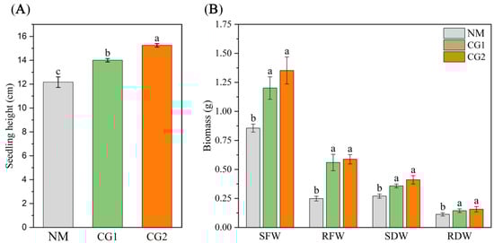 Effect of CG1 and CG2 inoculation on seedling height (A) and biomass (B) of Massion’s pine plants grown in toxic-metal-contaminated mine soil. Bars represent average values ± SE of three replicates. Different letters indicate statistically significant differences between different C. geophilum inoculations using one-way ANOVA followed by Dunnett’s test (p < 0.05). Non-inoculated plants (NM); shoot fresh weight (SFW); root fresh weight (RFW); shoot dry weight (SDW); root dry weight (RDW).