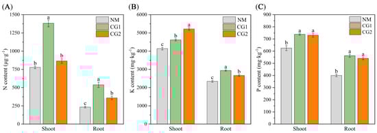 Nitrogen (N) (A), Potassium (K) (B), and Phosphorus (P) (C) content in shoots and roots of non-inoculated (NM) and inoculated (CG1, CG2) Massion’s pine plants grown in toxic-metal-contaminated mine soil. Bars represent average values ± SE of 3 replicates. Different letters indicate statistically significant differences between different C. geophilum inoculations by one-way ANOVA analysis followed by Dunnett’s test (p < 0.05).