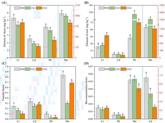 Cr, Cd, Pb, and Mn concentration in shoots (A) and roots (B), transfer factor (C), and bio-concentration factor (D) of non-inoculated (NM) and inoculated (CG1, CG2) Massion’s pine plants grown in toxic-metal-contaminated mine soil. Bars represent average values ± SE of 3 replicates. Different letters indicate statistically significant differences between different C. geophilum inoculations by one-way ANOVA analysis followed by Dunnett’s test (p < 0.05).